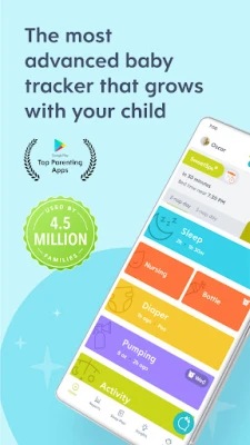 • Simple, one-touch baby tracker for sleep, diaper changes, feedings, pumping, growth, potty training, activities and medicine
